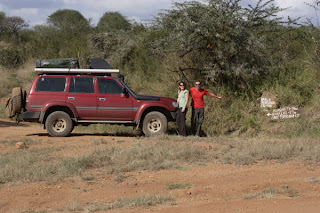As the camera clicked for the first time, a shiny new Land Cruiser with some insignia pulled up. The lady driver, who obviously had something to do with the nearby research station, said that she had to make sure we were not heading in the wrong direction. Maggie’s nose was in fact pointed in the wrong direction, but only for the photo and I assured her that we would not accidently drive into the militaries’ live firing range. She also told us to preferably stay in the car as the area had some very aggressive Buffalo and Elephant. I didn’t quite believe her, but we set off again while she was still watching. Ten minutes later we did in fact saw Ed on the road. As it happened, their bush camp was only a few kilometres from where we took the photos and he was leading a convoy back to Nanyuki. It was rather bizarre to randomly run into a friend from the UK in a small town in Kenya. It was even more bizarre to randomly run into the same friend on one of hundreds of bush roads in the middle of nowhere in an almost deserted northern Kenya. Small world…