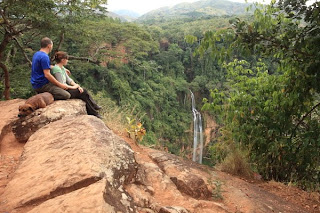 A visit to the compost toilet, the shower that irrigated the gardens and a strong mug of coffee completed the preparations before setting off down the garden path towards the 150m high waterfall near by. Aucke’s son guide3d us through the vegetable gardens and his dog, Kilimanjaro showed us the rest of the way to the entrance. The falls are “looked after” by the local village and a minimum charge of MK200 per person ($1.50) secures your entrance. From the ever accurate Lonely Planet we were expecting to walk down steps for a bout an hour to reach the bottom of the falls. There were in fact 7 steps (I counted them) to the top of the falls, and a trail that led far enough away to see the falls from straight on. They were impressive! The dense indigenous and untouched forests around them and the slightly overcast skies gave the impression of rain forest, primates and impenetrability. On the way back towards the gate the lady who was on duty directed us to the caves behind the falls. These were used by the ancestors, as she described them, to hide away from the Arab slave traders in centuries gone by.