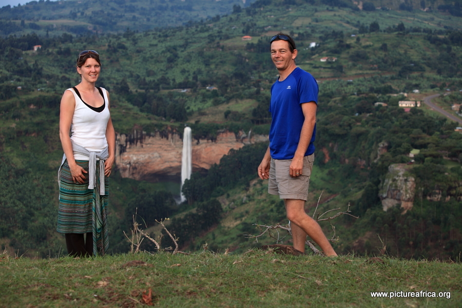 We left the camp site with a warning about asking permission before photographing people in the village and stopped at a local shop where Juma bought us each a bottle of water. This was included in our price. We started the steep climb through villages and farms, resting when we needed and learning interesting things about the area. Apparently this was where all Uganda’s long distance runners came from. The subsistence farms included big fields of Arabica Coffee and Juma explained the process of growing, harvesting, drying and roasting to us. The footpaths he chose were small and muddy and used by all the locals to ferry their produce and goods between places. We had to make space for donkeys and cattle a few times and eventually came to a clearing where the grass was kept and the benches built. We had arrived at the bottom of the top waterfall. This was an 85m high drop with masses of volume tumbling down it. If ever the power companies found out about that the hydro plant would be built in days!